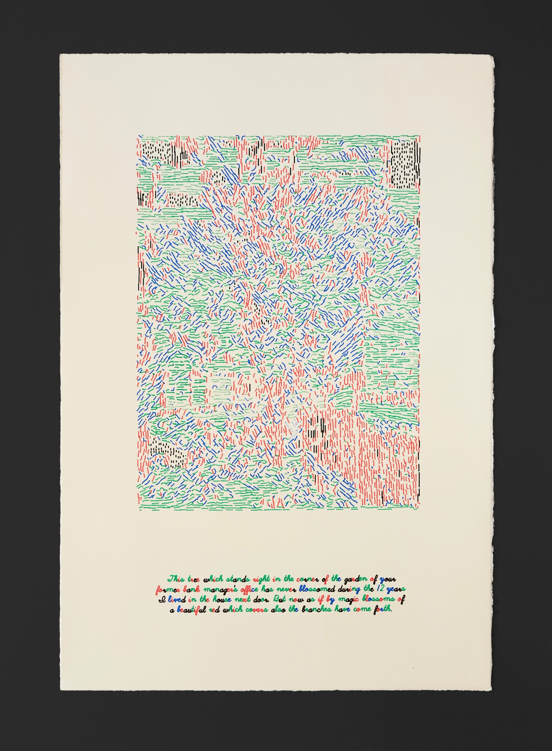 "This tree which stands right in the corner of the garden of your former bank manager's office has never blossomed during the 12 years I lived in the house next door. But now as if by magic blossoms of a beautiful red which covers also the branches have come forth."